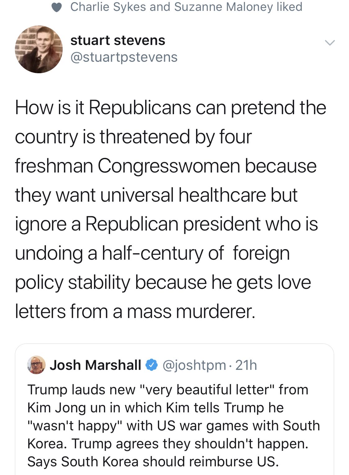 In the meantime, Back in the United States, President Trump left for his New Jersey Resort as he noted a "beautiful Letter" he received from the North Korean Leader and supposedly made a "Small Apology" for the recent missile launches as the US and South Korea conducted exercises. President Trump asked for reimbursements and promised a great future for North Korea although one of the more traditional Republicans noted this: